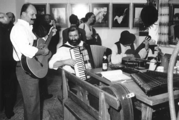 ...die allerlustigsten Leit san vom Oberreintalzweig... ausgelassene Feierstimmung am Hüttentisch(v.l.n.r.) Sepp Simon, die unvergessenen Hubert Bredl und Gitarrenmeister Wolfi Opitz